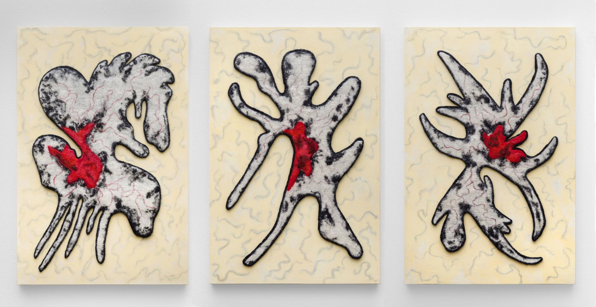 “That Can, But Has Not Yet Come, Yet Was”, Felt, Yarn, Cold Wax, Oil on Wood, 24” x 36” each, Series of 3